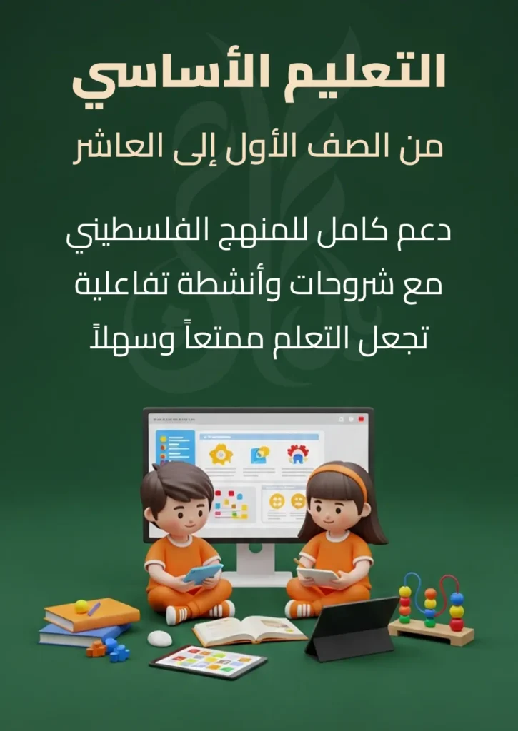 موادنا للمراحل المدرسية مصممة بعناية لتتوافق مع المنهج الفلسطيني الرسمي، مما يضمن لك دعماً تعليمياً يمكنك الوثوق به لتحقيق التفوق.